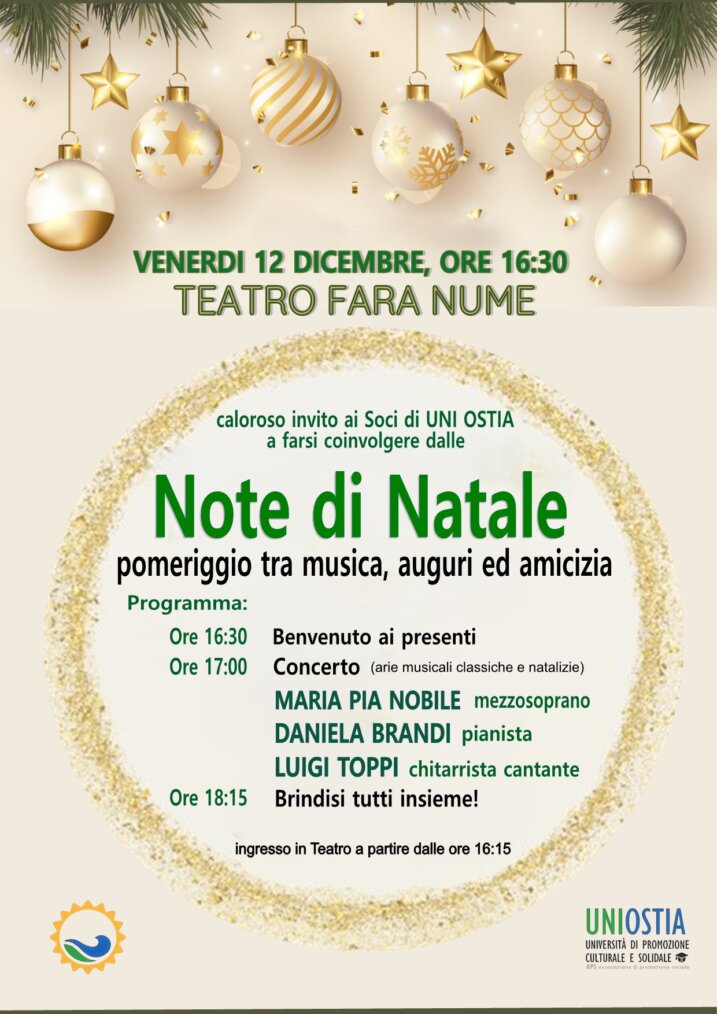 Per motivazioni diverse, venerdì 12 perché è in programma la FESTA DI NATALE dell'Associazione al Fara Nume, e martedì 16 perché tutti i locali dell'Istituto sono impegnati per lo svolgimento dell'Open Day della Scuola, in queste due date è sospesa ogni attività didattica di Uni Ostia. Ovviamente tutte le programmazioni saranno recuperate nel corso dell'Anno Accademico.