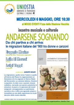 La migrazione, quella verso l’estero e quella all’interno del Paese ha rappresentato un fenomeno che ha segnato la Storia d’Italia del Novecento. La canzone italiana, d’autore e popolare, ha dato voce a questo vissuto collettivo, narrando con parole autentiche le emozioni, le paure e le speranze dei nostri emigranti, consegnandoci un patrimonio narrativo che ci offre uno sguardo umano e immediato su una delle esperienze tra le più decisive della nostra identità. Per saperne di più e scaricare la locandina, cliccare qui.